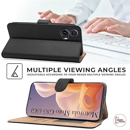 The MobieGenie Flip Cover for Motorola G85 5G, Moto G85 5G offers a sleek and sophisticated solution for protecting your device with 360-degree coverage. Made from premium leather material, this case provides a luxurious feel while ensuring durability and long-lasting protection against scratches, drops, and daily wear. The flip cover design features card slots and pockets, allowing you to conveniently store your essential cards and cash, reducing the need for a separate wallet. The magnetic closure keeps everything securely in place, while the case’s foldable design doubles as a stand, offering a hands-free viewing experience for videos, browsing, or video calls. The case is crafted with precision, providing easy access to all ports, buttons, and the camera, ensuring full functionality without removing the case. With its elegant black finish and thoughtful design, the MobieGenie Flip Cover combines style, convenience, and superior protection, making it the ideal accessory for your Moto G85 5G.