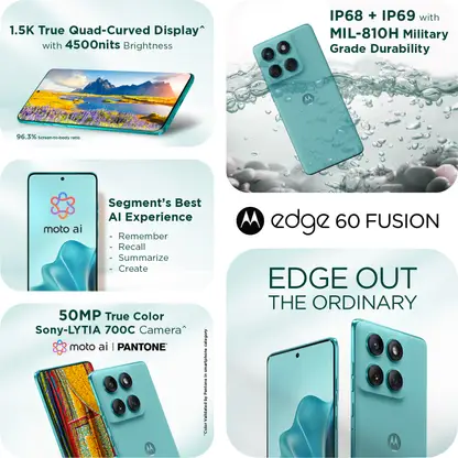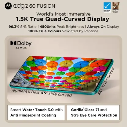 - The 17.018 cm (6.7) pOLED display delivers sharper detail and less pixelation. With a 1.5K 100% True All-Curved Display, Pantone Validation, and a Segment’s best 96.3% screen-to-body ratio, every visual feels immersive and lifelike. Enjoy 4500 nits peak brightness— ensuring clarity even in direct sunlight. The 120Hz refresh rate delivers ultra-smooth visuals, while Smart Water Touch 3.0 enhances touch accuracy. Built for durability, the display is protected by Gorilla Glass 7i and SGS Eye Protection for a comfortable viewing experience.