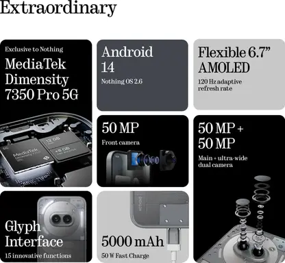 - 💡 Glyph Interface & Smart Features: Unique Glyph Interface for personalized notifications, Android 14 and Nothing OS 2.5 for modern usability.