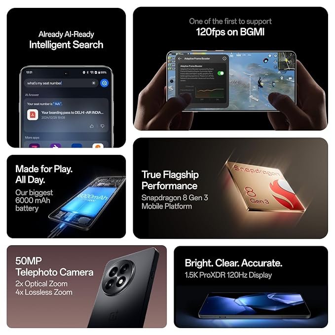 - Operating System: OxygenOS 15.0 based on Android 15 Platform: Snapdragon 8 Gen 3 Mobile Platform CPU: Qualcomm Kryo 980 CPU @3.3GHz GPU: Adreno 750 @903MHz RAM: 12GB/16GB LPDDR5X Storage: 256GB/512GB UFS 4.0 Battery: 6,000 mAh (single-cell 6,000 mAh, non-removable) Vibration: Haptic motor
