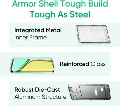 - The realme C61 is fortified rather than merely constructed. The maximum degree of durability is guaranteed by its ArmorShell Tough Build, which includes an Integrated Metal Inner Frame, Reinforced Glass, and a Sturdy Die-cast Aluminium Structure. This indicates that your gadget is made to survive everyday rigours, is resistant to accidental drops, and is bend-proof. For those who appreciate long-lasting technology, whether they are travellers or not, the realme C61 delivers unparalleled durability and strength right into your hand.