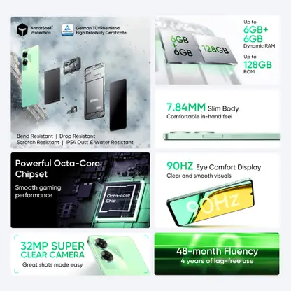- The realme C61, which offers unparalleled performance and longevity, is a masterpiece of engineering and design. Its ArmorShell Tough Build ensures outstanding resistance, which includes an Integrated Metal Inner Frame, Reinforced Glass, and a Die-cast Aluminium Structure. It passes stringent testing and is certified by TUV Rheinland for exceptional dependability. Enjoy lag-free usage for four years thanks to its 48-month Fluency certification. The 90 Hz Eye Comfort Display delivers excellent visuals, and seamless multitasking is ensured by up to 6 GB+6 GB Dynamic Memory. The Octa-core CPU provides top-notch performance, and the 5000 mAh Massive Battery allows for longer usage. Use the 32 MP Super Clear Camera to capture breathtaking details. The realme C61 is a streamlined package that blends innovation, durability, and great performance