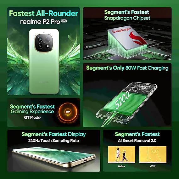 • Experience unparalleled visual brilliance with the realme P2 Pro’s 120Hz Curved AMOLED Display. This screen boasts a bright and eye-friendly technology, ensuring vibrant colours and deep contrasts for an immersive viewing experience. This display features a high dynamic photo technology, it delivers stunning clarity and lifelike details, making every image and video come alive with remarkable precision and brightness. Whether you’re gaming, streaming, or browsing, enjoy a display that sets a new standard for excellence.