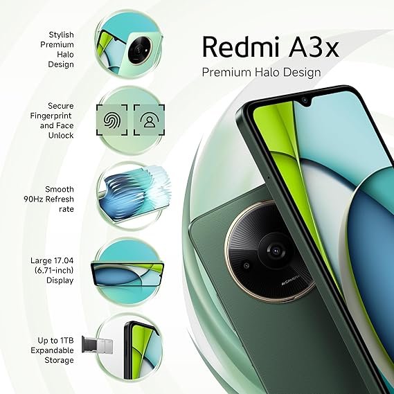 - Showcasing the Redmi A3X: a stylish and innovative device. It is a visual joy thanks to its innovative premium Halo design and thin 8.3mm flat frame. Experience a cinematic display on this huge 17.04 cm (6.71) screen with a smooth refresh rate of 90 Hz and Corning Gorilla Glass protection. Safe and rapid access is guaranteed by the Face Unlock feature and the side-mounted fingerprint scanner. Multitasking and storage are effortless with up to 128 GB of extendable storage and 4 GB of RAM (plus 4 GB of virtual RAM). With the 8 MP AI dual camera and vintage film filters, you may take beautiful pictures. Powered by a Type-C charger and a 5000 mAh battery, you can use it all day. Take pleasure in superiority with the Redmi A3X